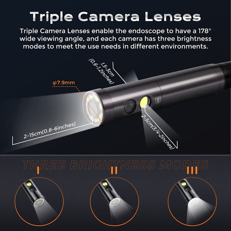 Thiết bị được trang bị 3 camera độ phân giải cao gồm camera trước và hai camera bên, giúp quan sát nhiều góc độ khác nhau trong đường ống hoặc thiết bị.